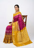 Elevate your ethnic wardrobe with this stunning Pure Ikkat Silk Saree, a masterpiece of traditional handloom craftsmanship. Featuring a vibrant magenta body adorned with classic white Ikkat drop motifs, this saree transitions beautifully into a striking mustard yellow border and pallu. The intricate chevron temple borders and the rich, woven diamond patterns on the pallu showcase the authentic artistry of Ikkat weaving. Finished with an elegant gold zari border, this saree offers a luxurious drape and a radiant finish. Perfect for weddings, festive celebrations, and special occasions, it effortlessly blends timeless heritage with contemporary elegance.